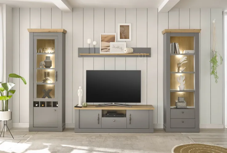 Die Wohn-Kombination enthält Lowboard, Standregal, Vitrine sowie Wandboard und besteht aus solider Holznachbildung. Mit dem grauen Korpus wirken die Möbel top modern, während die Fräsungen und Applikationen in Artisan-Oak-Dekor rustikales Flair verleihen. Neben der eleganten Optik bietet die Wohnzimmerwand viel Stauraum. In neun offenen Fächern finden Bücher und Dekorationen Platz, während sich Alltagsgegenstände hinter Türen und in Schubkästen sicher aufbewahren lassen. Die Vitrinen mit Glaseinsatz sind ideal für die Präsentation von Lieblingsstücken geeignet.