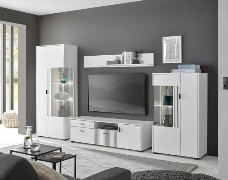 Die Wohnwand HUDSON vereint modernes Design mit praktischer Funktionalität. Mit einer Breite von 320 cm, einer Höhe von 180 cm und einer Tiefe von 42 cm bietet sie großzügigen Stauraum und eine stilvolle Präsentationsfläche. Die Hauptfarbe ist Weiß, ergänzt durch schwarze Akzente, die dem Ensemble eine elegante Note verleihen. Die matte Optik der Holznachbildung harmoniert perfekt mit den klaren Glaselementen der Vitrinen, die Ihre Lieblingsstücke ins rechte Licht rücken.