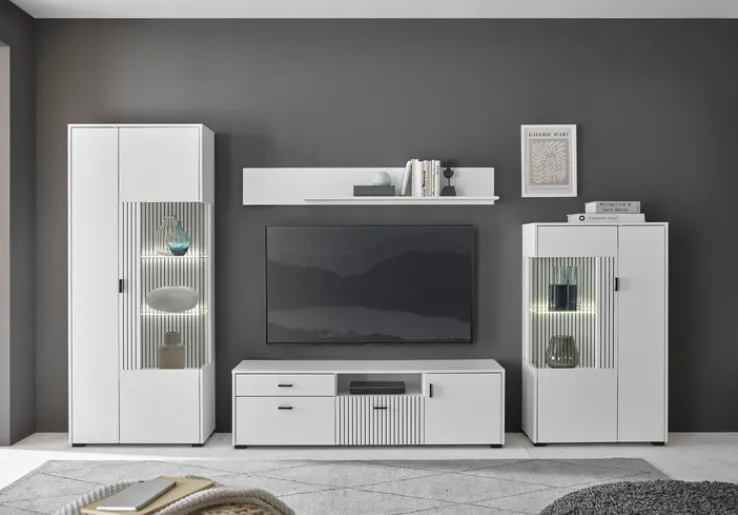 Das Set besteht aus vier Teilen: zwei Vitrinen, einem Lowboard und einem Wandboard. Die Vitrinen sind 75 cm breit und bieten mit Höhen von 108 cm und 125 cm ausreichend Platz für dekorative Objekte. Das Lowboard mit einer Breite von 150 cm und einer Höhe von 44 cm eignet sich ideal für Ihr TV-Gerät und bietet zusätzlichen Stauraum in einem Schubkasten. Das Wandboard rundet das Set ab und bietet mit einer Länge von 150 cm eine perfekte Ablagefläche für Bücher oder Dekorationen. Die klaren Linien und die moderne Gestaltung machen die Wohnwand HUDSON zu einem Blickfang in jedem Wohnzimmer.