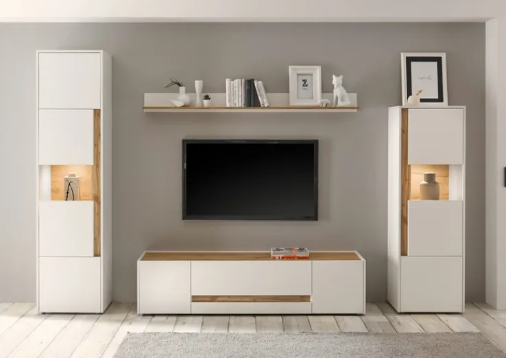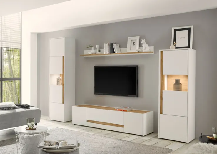 Die Wohnwand CITY vereint modernes Design mit skandinavischem Stil und bietet eine elegante Lösung für Ihr Wohnzimmer. Die Kombination aus Weiß und Wotan-Eiche-Dekor verleiht dem Möbelstück eine zeitlose Ästhetik, die sich nahtlos in verschiedene Einrichtungsstile einfügt. Die Wohnwand besteht aus vier Teilen: zwei Vitrinen, einem Lowboard und einem Wandboard. Die Vitrinen bieten mit ihren Drehtüren und der integrierten Beleuchtung eine stilvolle Möglichkeit, Dekorationsobjekte zu präsentieren. Das Lowboard bietet ausreichend Platz für Unterhaltungselektronik und verfügt über einen Schubkasten für zusätzlichen Stauraum.