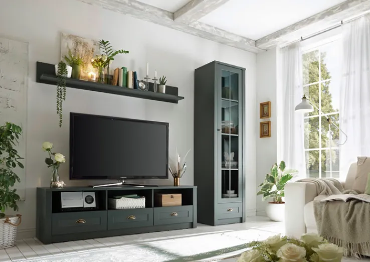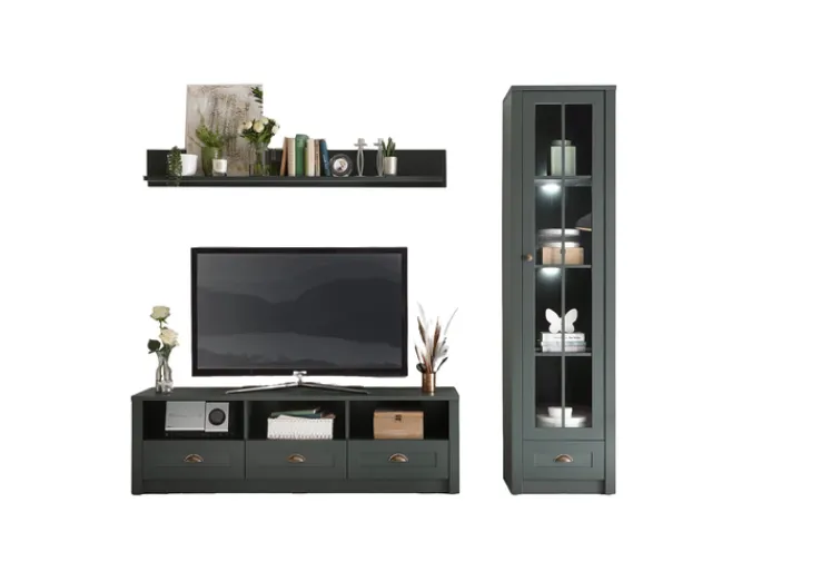 Die Wohnwand „ASCOT“ vereint modernes Design mit einem Hauch von Landhausstil und bietet eine stilvolle Lösung für Ihr Wohnzimmer. Die Hauptfarbe ist ein elegantes Grün, das durch goldfarbene Akzente ergänzt wird. Die Kombination aus Holznachbildung und Glas verleiht dem Möbelstück eine hochwertige Optik. Die Wohnwand besteht aus drei Teilen: einer Vitrine, einem Lowboard und einem Wandboard. Die Vitrine misst 50 cm in der Breite, 197 cm in der Höhe und 43 cm in der Tiefe und bietet ausreichend Platz für dekorative Objekte hinter einer Glastür.