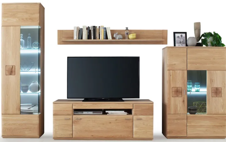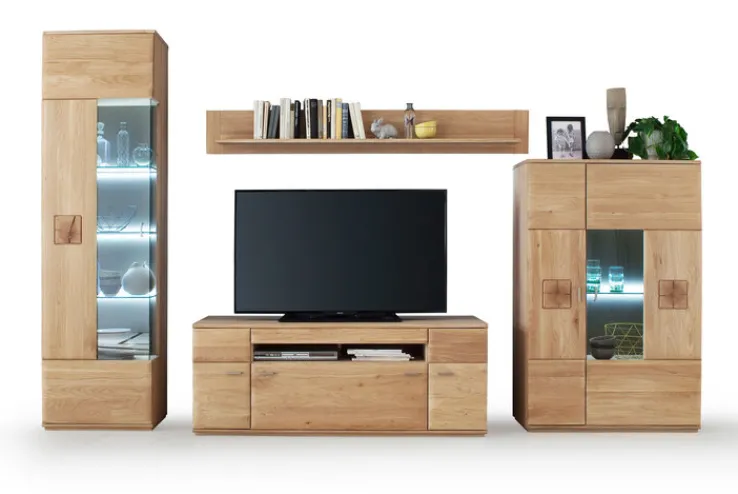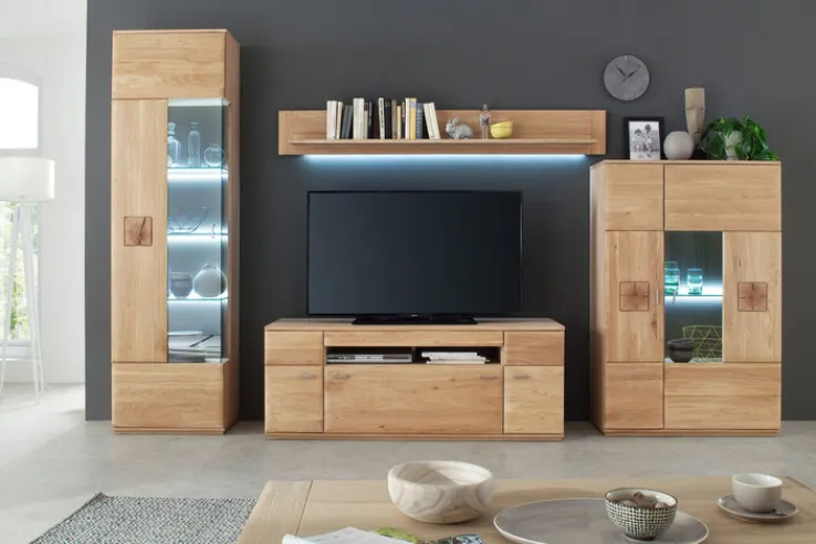 Die tolle Wohnwand hat eine Länge von 320 cm und präsentiert sich zeitlos elegant. Die schönen Möbel aus teilmassiver Eiche bianco haben eine dekorative Optik und passen ideal in kleine Wohnzimmer. Die Wohnwand besteht aus einer Vitrine, einem Lowboard, einem Wandregal und einem Highboard. Die einzelnen Möbelstücke sind individuell im Wohnraum platzierbar.