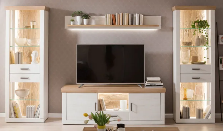 Das Set besteht aus zwei Schränken, einem Wandboard und einem TV-Lowboard. Jeder Schrank hat eine Breite von 71 cm, eine Höhe von 205 cm und eine Tiefe von 40 cm. Das Wandboard misst 181 cm in der Breite, 24 cm in der Höhe und 22 cm in der Tiefe. Das TV-Lowboard bietet mit einer Breite von 181 cm, einer Höhe von 62 cm und einer Tiefe von 50 cm ausreichend Platz für moderne Unterhaltungselektronik. Die klaren Linien und die dezente Beleuchtung der Glasböden setzen dekorative Akzente und bieten gleichzeitig praktische Ablageflächen.