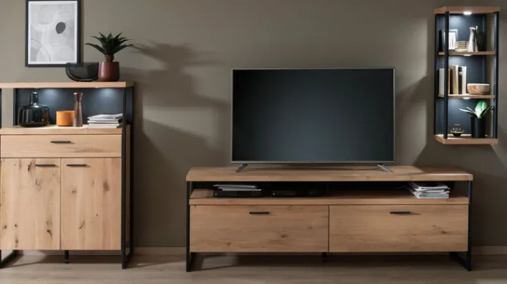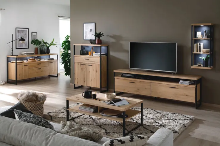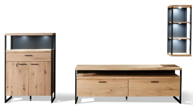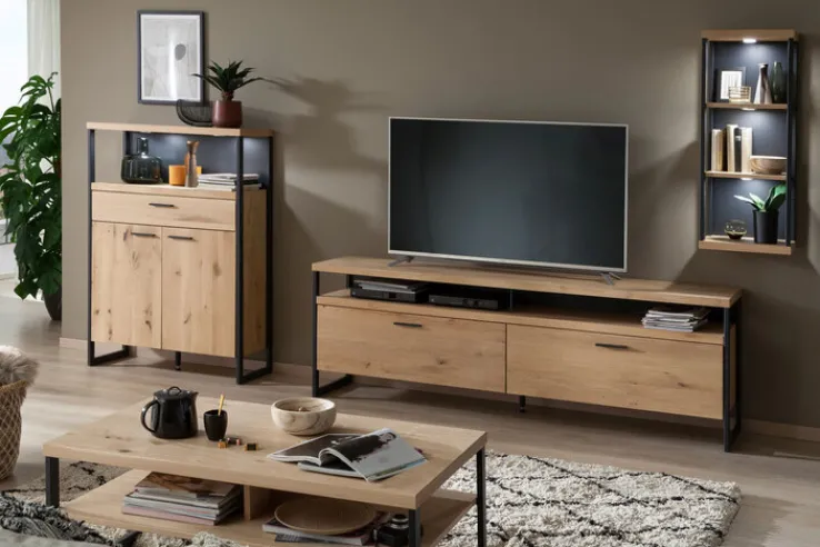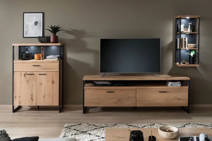 Gefertigt aus teilmassivem Eichenholz, kombiniert mit Glas und Metall, bietet die Wohnwand eine robuste und langlebige Konstruktion. Die Oberflächen sind geölt und lackiert, was die natürliche Holzmaserung betont und gleichzeitig Schutz bietet. Die Möbelstücke verfügen über Griffe, die das Öffnen und Schließen erleichtern. Die Wohnwand bietet zudem zwei offene Fächer und einen Einlegeboden, die zusätzlichen Stauraum schaffen. Beleuchtung ist nicht inklusive, was Ihnen die Freiheit gibt, Ihre eigene Beleuchtungslösung zu integrieren. Diese Wohnwand ist ideal für alle, die Wert auf Qualität und zeitloses Design legen.