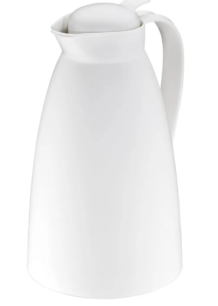 Diese schwarze Isolierkanne ECO aus pflegeleichtem Kunststoff mit der praktischen Einhand-Ausgießtaste ist mit einem Volumen von 1,0 Litern erhältlich.