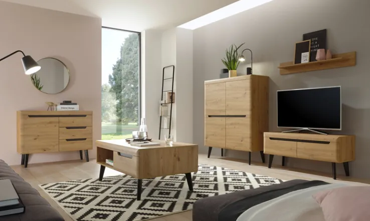 Die Wohnwand TORGE bietet eine moderne und stilvolle Lösung für Ihr Wohnzimmer. Sie besteht aus vier Teilen: einem Lowboard, einem Sideboard, einem Highboard und einem Wandboard. Die Hauptfarbe ist Braun mit einem Dekor in Artisan Eiche und schwarzen Applikationen, was dem Set einen eleganten und zeitgemäßen Look verleiht. Die Möbel sind aus Holznachbildung und Glas gefertigt, wobei die mitteldichte Faserplatte für Stabilität sorgt. Das Lowboard misst 107 cm in der Breite, 50 cm in der Höhe und 40 cm in der Tiefe und bietet ausreichend Platz für Ihr TV-Gerät. Das Sideboard und das Highboard haben jeweils die gleiche Breite von 107 cm, unterscheiden sich jedoch in der Höhe mit 83 cm und 134 cm. Beide bieten zusätzlichen Stauraum mit insgesamt vier Drehtüren und fünf Schubkästen. Das Wandboard ist 107 cm lang und 17 cm tief, ideal für Dekorationen oder Bücher. Die klaren Linien und die Kombination aus Holz- und Glaselementen unterstreichen den modernen Stil der Serie. Die Möbel sind funktional und bieten vielseitige Ablagemöglichkeiten, ohne Beleuchtungselemente, was die schlichte Eleganz betont. Diese Wohnwand ist eine perfekte Ergänzung für jedes moderne Zuhause und bietet sowohl Stil als auch Funktionalität.