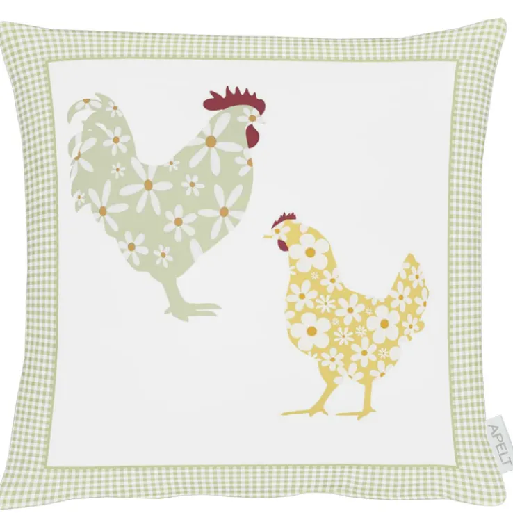 Zu Ostern treffen auf dieser Kissenhülle Hahn und Huhn aufeinander. Die Hülle für Kissen aus dem Hause APELT ist geprägt durch viel Grün und Gelb. Umrandet ist dieser schicke Überzug zudem mit einem grün-weißen Karomuster. Die Kissenhülle HAHN & HUHN besteht aus einem Mischgewebe. Zum Einsatz kommen hier zu 75 Prozent Polyester (PES) und zu 25 Prozent Baumwolle (Cotton). Die quadratische Hülle mit Hahn und Huhn ist bei 30 °C waschbar.
