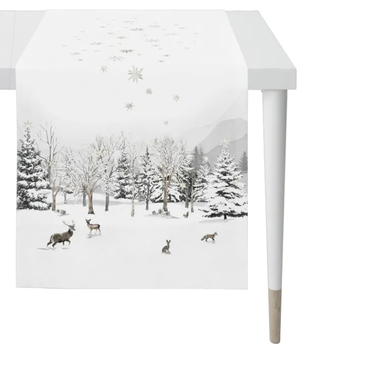 Der Tischläufer „Waldtiere im Schnee“ von Apelt bringt eine winterliche Atmosphäre in Ihr Zuhause. Mit einer Breite von 48 cm und einer Länge von 140 cm passt er perfekt auf viele Tische. Die Hauptfarbe Weiß wird durch graue Akzente ergänzt, die das winterliche Design unterstreichen. Der Tischläufer zeigt eine idyllische Schneelandschaft mit Tieren wie Hirschen, Hasen und Füchsen, die zwischen schneebedeckten Bäumen und Tannen zu sehen sind. Diese detailreiche Darstellung verleiht Ihrem Tisch eine elegante und zugleich gemütliche Note.