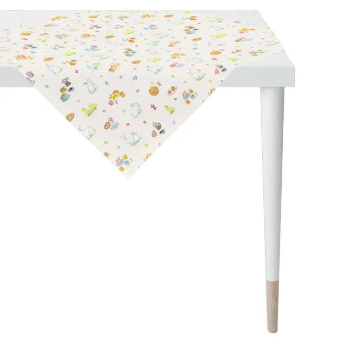 Die mehrfarbige APELT Tischdecke HÄSCHEN & FRÜHSTÜCKSD. ALL-OVER mit den Maßen 88 x 88 cm zaubert Osterstimmung in Wohnzimmer und Essbereich. Mit ihrem bezaubernden Druck mit Häschen und allem, was beim gemütlichen Oster-Brunch nicht fehlen sollte, passt sie hervorragend zu traditioneller Osterdekoration.