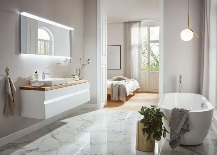 Der silberfarbige b.collection Flächenspiegel ESSENCE überzeugt mit seiner schlichten Eleganz und ist eine Bereicherung für modern eingerichtete Badezimmer oder Duschen. Durch seine Breite von etwa 160 cm passt der große Spiegel sehr gut über einen rechteckigen Waschtisch mit einem oder zwei Waschbecken. Ausgestattet mit einer energieeffizienten LED-Flächenleuchte, setzt der Spiegel den Bereich des Waschtischs gekonnt in Szene.