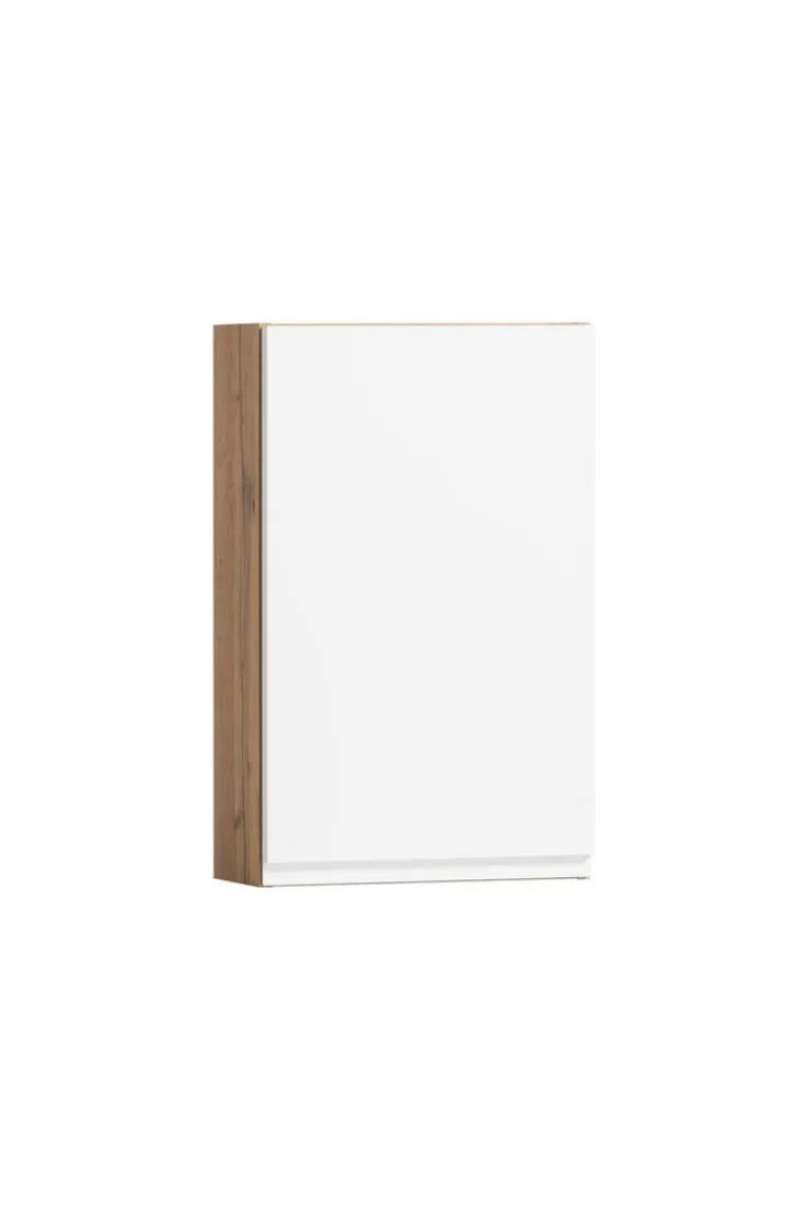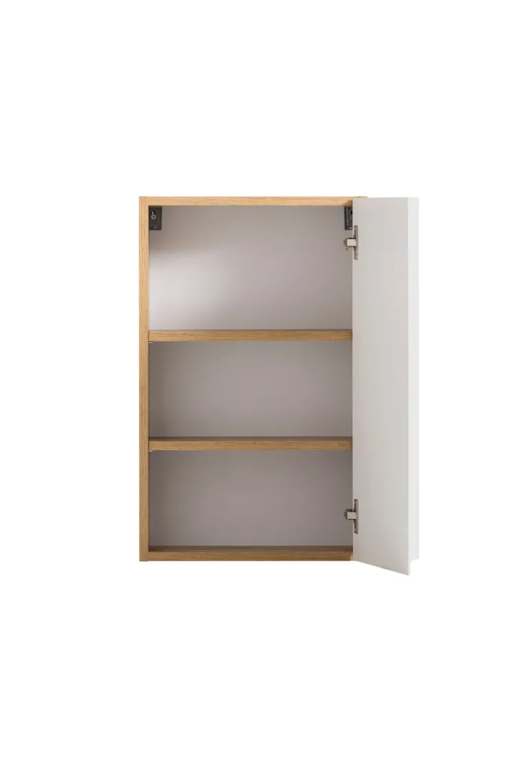Der Bad-Hängeschrank GENT hat eine Größe von 40 x 64 x 20 cm und ist die perfekte Ergänzung zum Unterschrank der Serie. Er kombiniert einen Korpus in rustikaler Wotaneiche Nachbildung mit einer matt weißen, grifflosen Front. Das Ergebnis ist ein solides Möbelstück mit stylischem Aussehen, kombiniert mit natürlichem Charme. Hinter der Tür befinden sich zwei Einlegeböden, auf denen sich Pflege- und Hygieneprodukte sowie Handtücher übersichtlich aufbewahren lassen.