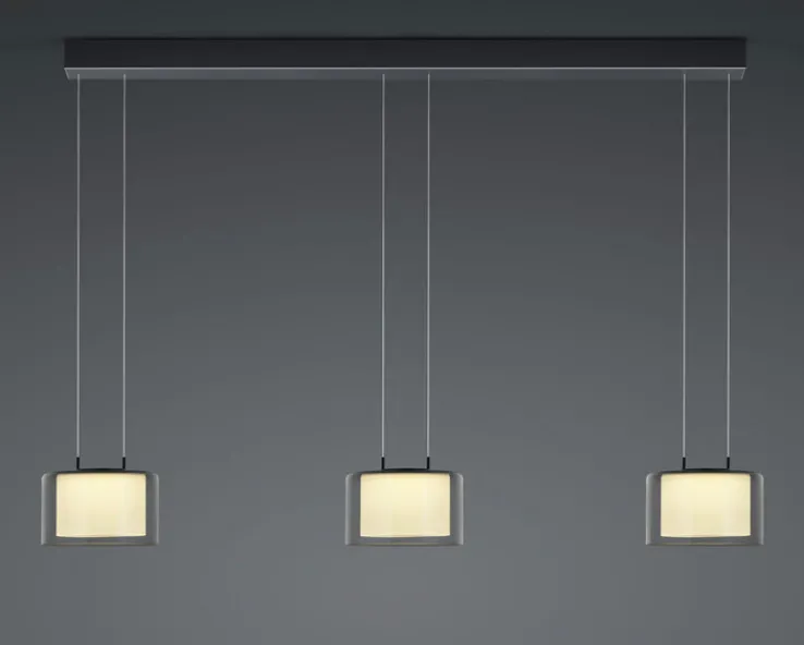 Das BANKAMP LED Balkenpendel GRAND SMOKE ist eine 3-flammige Leuchte, gefertigt aus Metall im Farbton Anthrazit matt eloxiert mit einem Schirm aus transparentem Kristallglas. Sie ist 123 cm breit und hat eine Höhe von 150 cm.