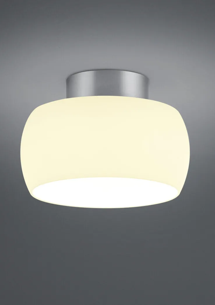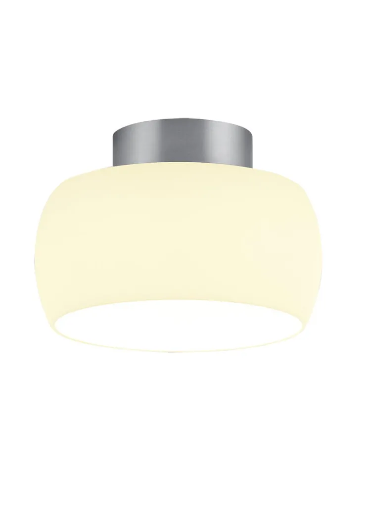 Die Deckenlampe BELL bringt eine runde Form mit einem Durchmesser von 23 cm, einer Höhe von 16 cm und 0,92 kg Gewicht mit. Der Korpus besteht aus alu-/nickelfarbigem Metall und der Schirm ist aus weißem Opalglas in matter Optik mit satinierter Oberflächenbeschichtung gefertigt.