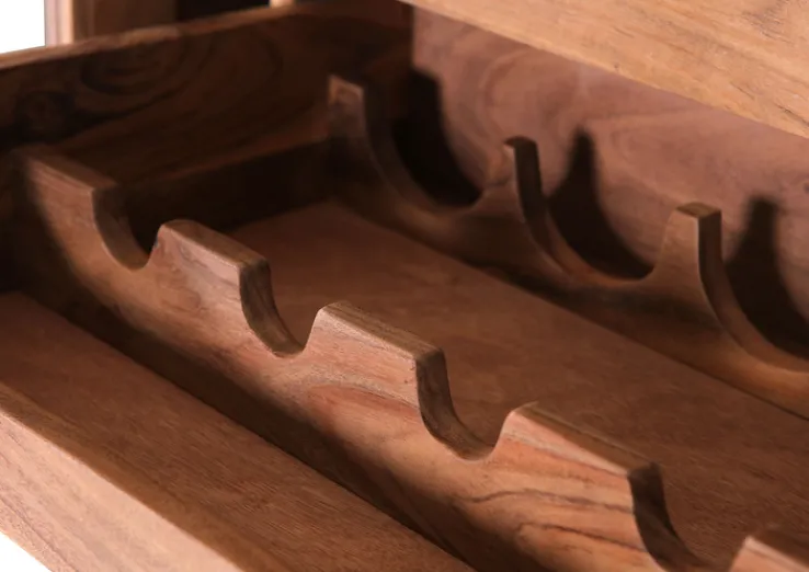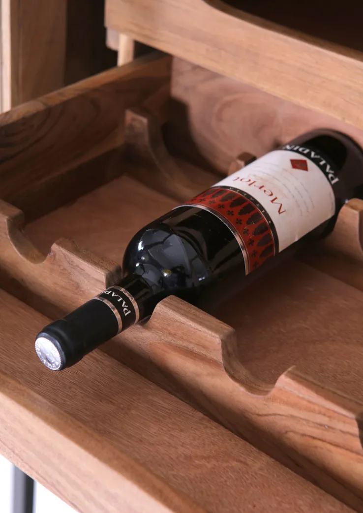 Der Schrank verfügt über drei Schubkästen sowie 3 Schubkästen für je vier Flaschen. Die zwei Drehtüren sind mit Glaseinsätzen versehen, die einen Blick auf den Innenraum gewähren und den Inhalt stilvoll präsentieren. Die Soft-Close-Funktion sorgt für ein sanftes und geräuschloses Schließen.
