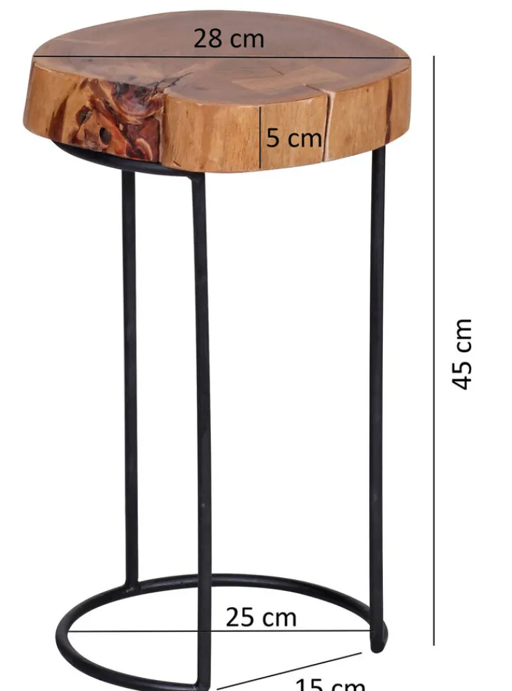 Dieser Tisch in runder Form hat eine Höhe von 45 cm, wodurch er sich für die Sofaecke genauso eignet wie als alleinstehender Dekohalter an der Wand. Mit seinem Durchmesser von 28 cm bietet er dabei Platz für etwa eine Tischlampe oder Accessoires. Die aus braunem Akazienholz bestehende Tischplatte hat eine Dicke von 5 cm, wodurch sie sehr stabil ist; das Kufengestell aus Metall in mattem Schwarz bildet dazu einen ansprechenden Kontrast.
