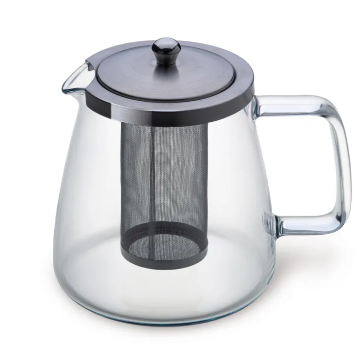 Die Teekanne der Serie CHARME besticht durch ihr klares, transparentes Design und eine moderne Formgebung. Das Fassungsvermögen beträgt 1.100 ml bei einer Höhe von 15 cm. Der Korpus besteht aus Borosilikatglas, das für seine Hitzebeständigkeit und Langlebigkeit bekannt ist. Der Deckel sowie das feinmaschige Sieb sind aus Edelstahl gefertigt und setzen einen eleganten, schwarzen Akzent. Das glatte Glas sorgt für eine klare Sicht auf den Inhalt und erleichtert die Kontrolle beim Aufbrühen. Der große Glasgriff ist ergonomisch geformt und unterstützt eine sichere Handhabung. Die Teekanne eignet sich besonders für den Einsatz in der Küche und bietet mit ihrem zeitlosen Erscheinungsbild vielfältige Kombinationsmöglichkeiten. Die Oberfläche zeigt keine strukturierten Muster, sondern bleibt durchgehend glatt und transparent.