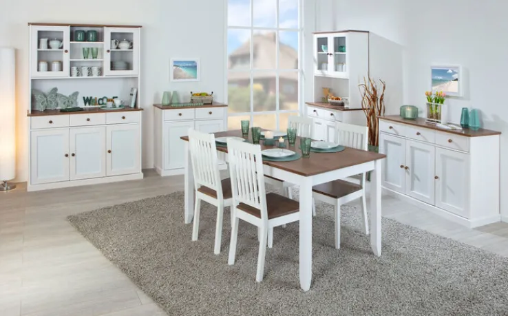 Das Buffet JACOB 6.2 in Weiß/ Braun besteht aus robustem Massivholz. Mit seinem eleganten Look im Landhausstil zieht es alle Blicke auf sich und verleiht dem Essbereich ein gemütliches Ambiente.