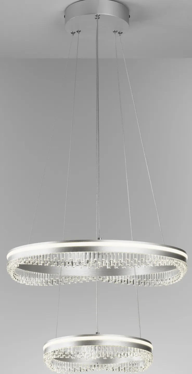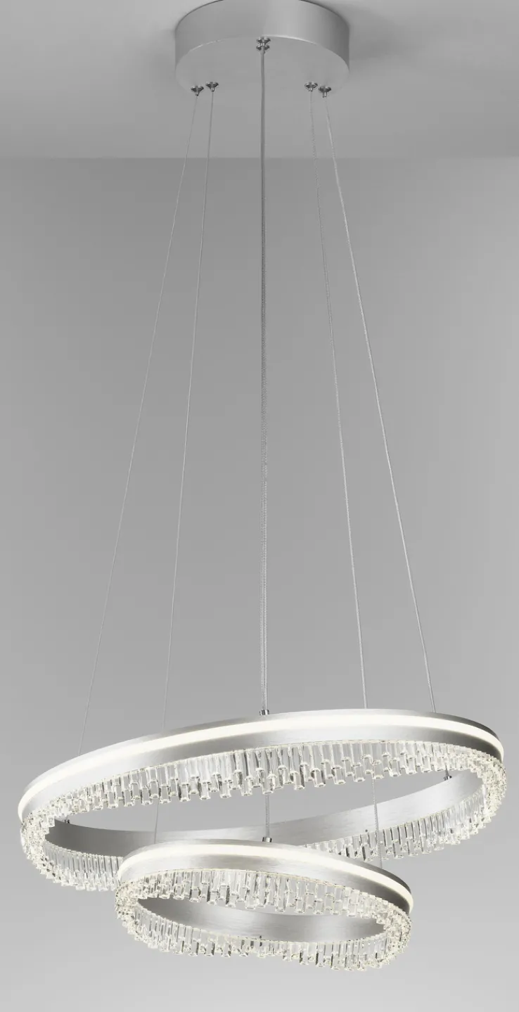 Unter dem casaNOVA Modell AUDREY verbirgt sich eine stilvolle, silberfarbene LED Pendelleuchte AUDREY aus Metall und Kunststoff mit einem Gesamtdurchmesser von 50 cm. Sie ist dimmbar, verfügt über eine Länge von 150 cm und zwei Ringe stellen die Beleuchtungsbasis dar.
