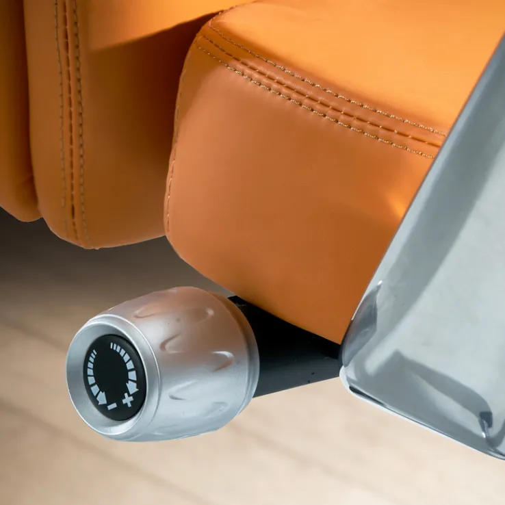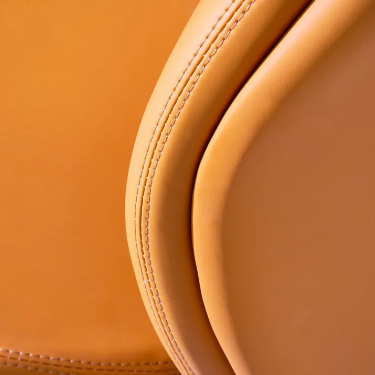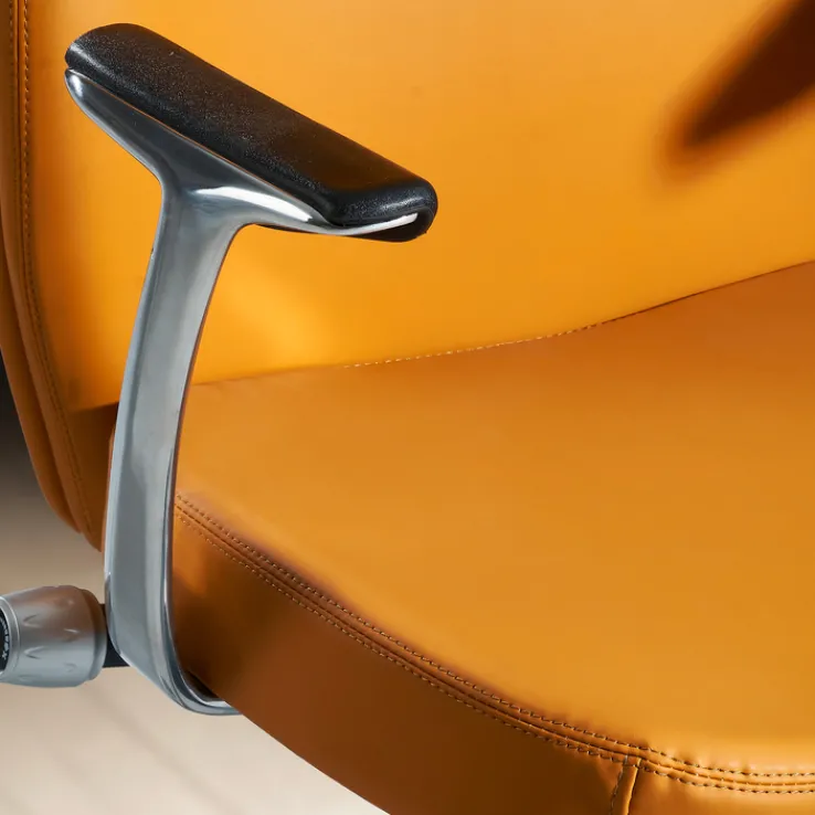 Sitz und Rückenlehne sind angenehm gepolstert. Dazu passen die schwarzen Armlehnen und das dunkle Metalldrehkreuz. Die fünf Rollen dienen der Sicherheit, denn der Stuhl kann nicht kippen. Zudem kann man damit bei Bedarf hin- und herrollen. Die hohe Rückenlehne ist ausgesprochen komfortabel, da sie ergonomisch geformt ist und den unteren Rücken stützt. Die sorgfältige Verarbeitung des Kunstleders sorgt für eine wunderbare Optik.