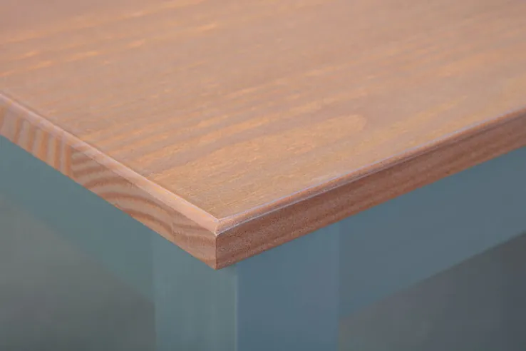 Der große Tisch mit den grauen Beinen und der braunen Platte hat ein klassisches Vierfußgestell, sodass das Modell auf jedem Boden stabil steht. Alle Bestandteile des Esstisches sind aus echtem Kiefernholz gearbeitet. Da die Oberflächen des Tisches alle mit einem Klarlack bearbeitet sind, lässt sich das Modell rasch von Schmutz befreien. Der Tisch wiegt insgesamt 19,2 Kilogramm.