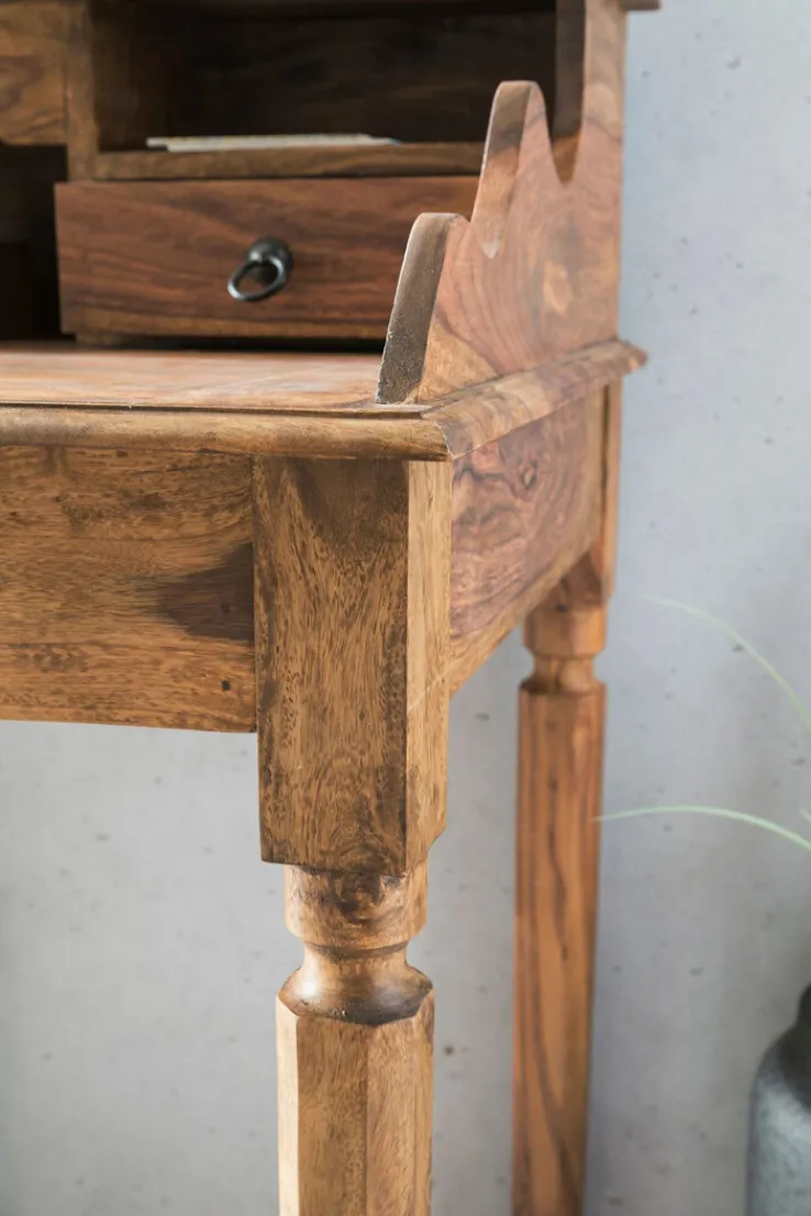 Dank der sorgfältigen Verarbeitung und der gebeizten Oberfläche strahlt der Schreibtisch in Sheesham braun Wärme und Eleganz aus. Mit einer großzügigen Arbeitsfläche von 115 x 60 cm bietet er ausreichend Platz für Ihre kreativen Projekte. Im Lieferumfang enthalten sind der Schreibtisch mit Tischplatte, die drei Schubkästen und drei offenen Fächer.