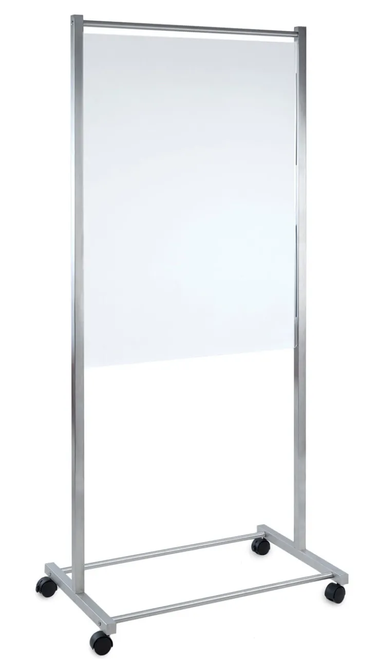 Das stabile Gestell der modernen Stellwand besteht aus rostfreiem Edelstahl. Die Oberflächen des hochwertig verarbeiteten Metalls sind gebürstet. Der eigentliche Sichtschutz ist aus weißem Plexiglas gefertigt. Das verwendet Material ist blickdicht und pflegeleicht. Für die Mobilität ist das Gestell mit zwei beweglichen und zwei festen Möbelrollen ausgestattet.