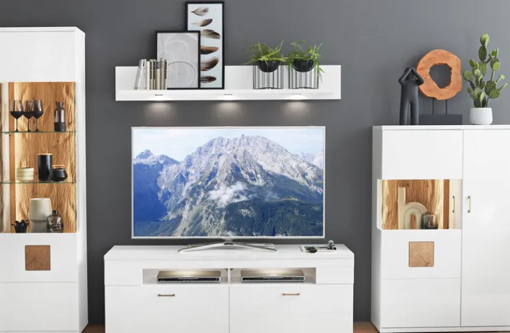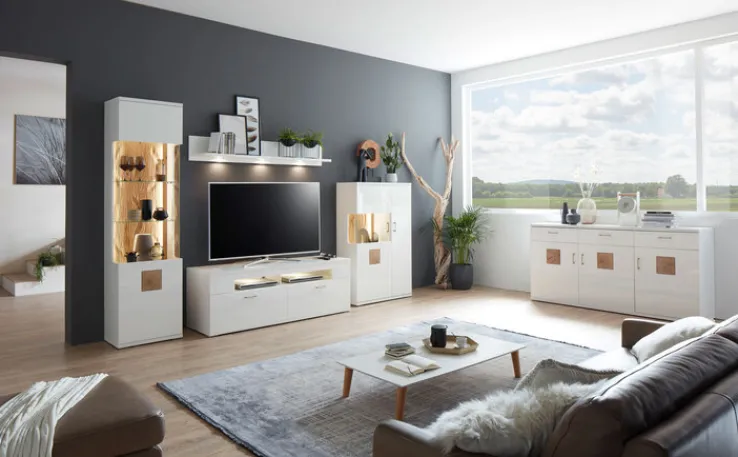 Die CASAVANTI Wohnwand TOPEKA benötigt eine Stellfläche von 330 x 208 x 50 cm. Sie besteht aus einer Vitrine, einem TV-Lowboard, einem Highboard und einem Paneelablageboden. Hergestellt aus matt weiß folierter Holznachbildung, sind die Möbel sehr stabil. Zum Highlight werden sie jedoch durch die Sichtrückwände aus sandgestrahlter Eiche und Hirnholz-Einsätzen an den Fronttüren. Zusätzlich zum angesagten Design bietet die Wohnwand in offenen und geschlossenen Fächern sowie in Vitrineneinsätzen viel Platz für Alltagsgegenstände, Medienzubehör und Dekorationen.