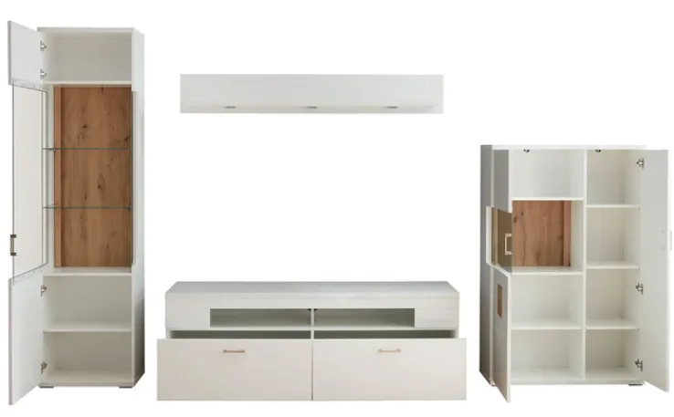Mit der 4-teiligen CASAVANTI Wohnwand TOPEKA in Weiß/Braun kommt jede Menge Stauraum in das Wohnzimmer. Gleichzeitig begeistern die Möbel mit einem top modernen Design mit rustikalem Twist.