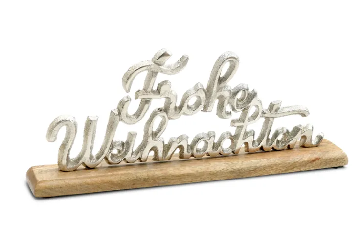 Dieses Deko Objekt aus der Serie CALM & COSY besteht aus einer Schriftzug-Skulptur mit dem Text ‚Frohe Weihnachten‘. Die Buchstaben sind aus silberfarbenem Aluminium gefertigt und besitzen eine strukturierte, leicht glänzende Oberfläche. Die Schrift ist in einer geschwungenen, dekorativen Schreibschrift gestaltet. Der stabile Sockel besteht aus braunem Mangoholz und zeigt eine natürliche Holzmaserung mit glatter Oberfläche. Die Maße betragen 30 cm in der Breite, 14 cm in der Höhe und 5 cm in der Tiefe. Dieses Objekt ist für den Innenbereich geeignet und kombiniert Holz und Metall zu einem festlichen Akzent für die Wohnraumdekoration.