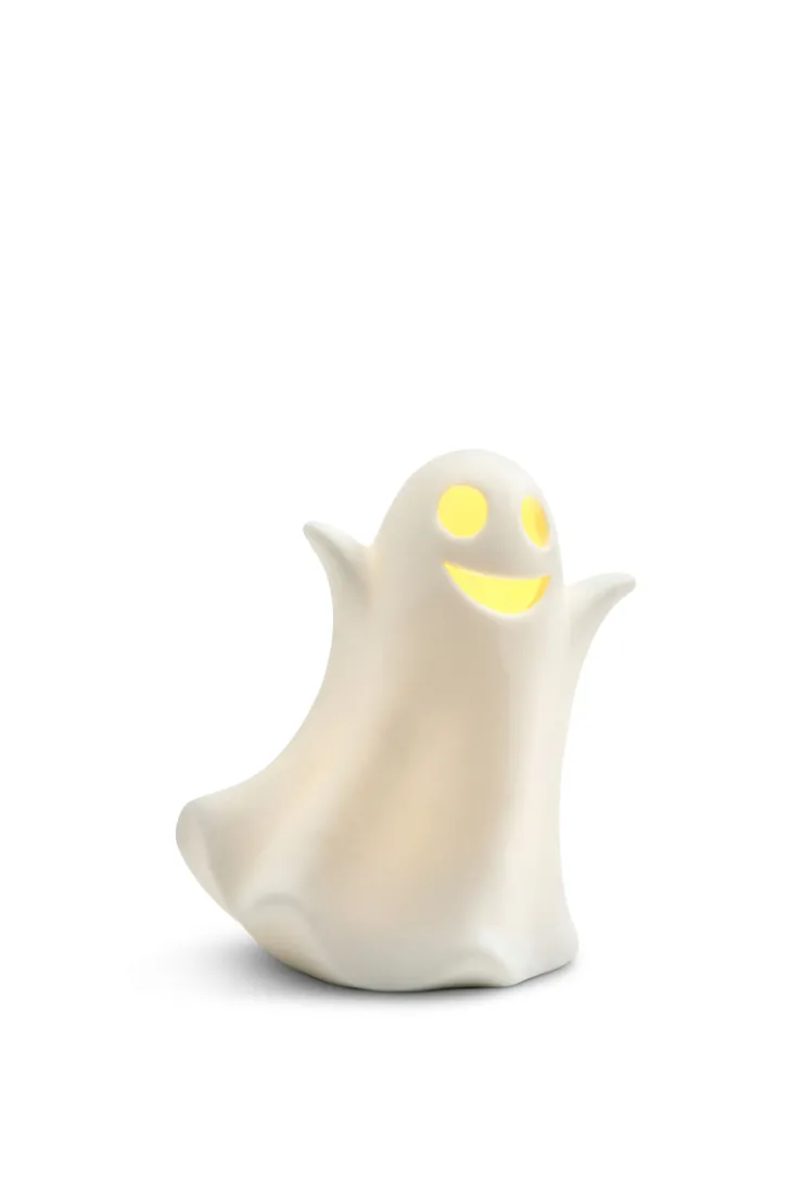 Die Dekofigur in Form eines freundlich gestalteten Geistes präsentiert sich in der Hauptfarbe Weiß und eignet sich für den Innenbereich, insbesondere das Wohnzimmer. Mit kompakten Maßen von 6,5 cm Tiefe, 7,8 cm Breite und 8,8 cm Höhe passt sie problemlos auf Regale, Sideboards oder Fensterbänke.