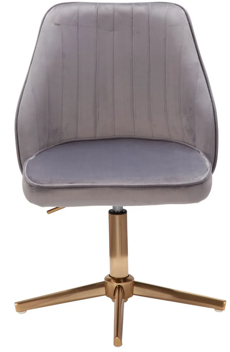 Der Drehstuhl grau/ goldfarbig im Retrodesign kann bis 120 Kilogramm Körpergewicht belastet werden. Er misst mit Rückenlehne 100 cm, ist 47 cm breit und 46 cm tief. Die Sitzhöhe kann auf 40 bis 60 cm eingestellt werden.