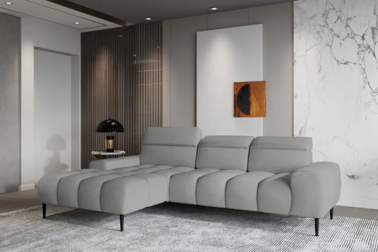Das Sofa ist mit einer Nosagfederung und PUR-Schaum gepolstert, was für optimalen Sitzkomfort sorgt. Die manuelle und motorische Verstellung der Sitztiefe sowie die verstellbaren Kopfstützen bieten individuelle Anpassungsmöglichkeiten. Die Armlehnenhöhe beträgt 57 cm, während die Sitzhöhe bei 46 cm liegt, was eine bequeme Sitzposition ermöglicht. Mit einem Gewicht von 131,8 kg ist das Sofa robust und langlebig. Dieses Ecksofa ist die perfekte Wahl für alle, die Wert auf Komfort und modernes Design legen.