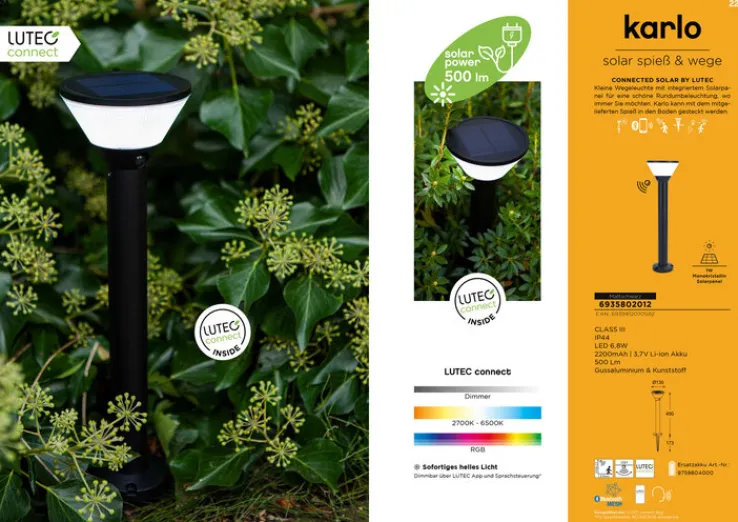 Das integrierte Solarpanel im rundlich geformten Kopf der KARLO LED Solar Wegeleuchte von ECO-LIGHT sorgt für eine harmonische Rundumbeleuchtung. Mit Smart-Sprachassistenten wie Lutec connect kompatibel und mit einem Erfassungswinkel von 120 ° ausgestattet, können sich Bewohner und Gäste auch in der Dunkelheit sicher über das Grundstück bewegen.