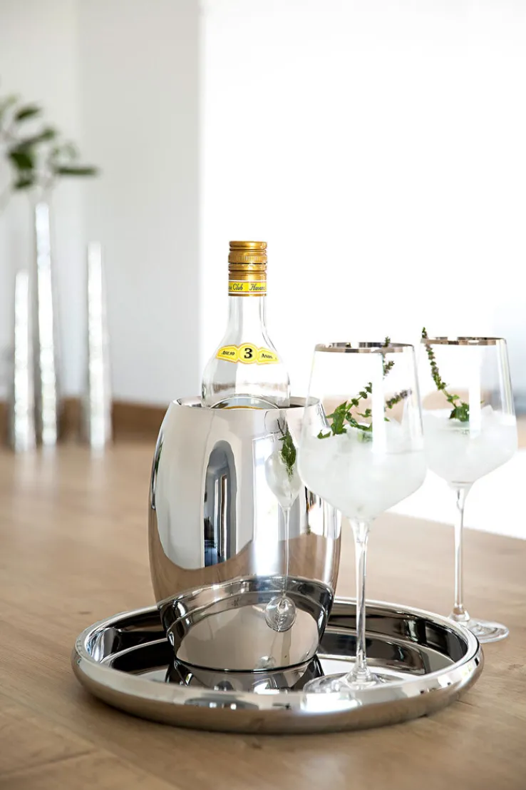 Ein schlichtes und zeitlos elegantes Design zeichnet diesen praktischen Weinkühler aus, in welchem ein edler Weißwein oder auch ein Sekt auf eine optimale Kühltemperatur gehalten wird. Er leistet am Tisch immer wertvolle Dienste und erspart den wiederholten Gang zum Kühlschrank. Zudem ist der Weinkühler APOLLO mit hochglänzender Oberfläche beim romantischen Dinner zu zweit oder bei allen festlichen Anlässen ein dekorativer Blickfang. Eine ideale Ergänzung zum Weinkühler ist das Fink Tablett APOLLO aus Edelstahl.