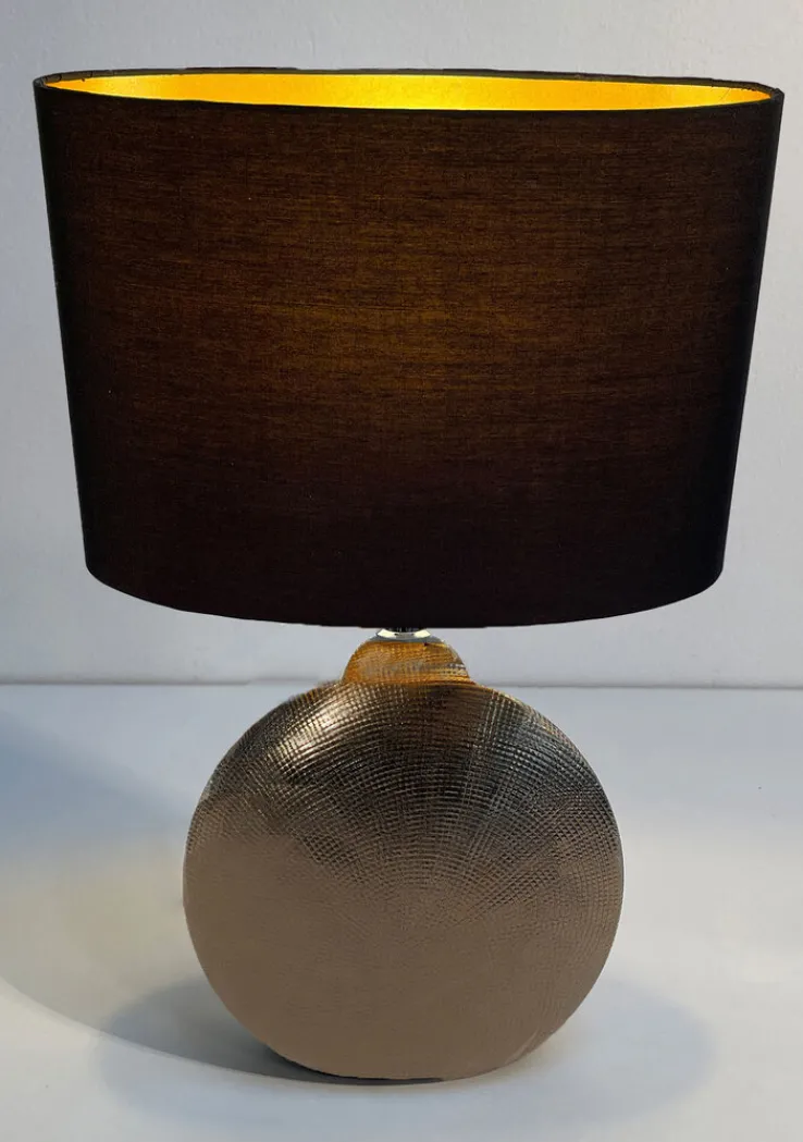Ihr schickes Oval des Standfußes ist auffällig strukturiert. Es kontrastiert sehr angenehm mit dem Lampenschirm, der seinerseits nach oben weiter wird. Innen leuchtet er goldfarbig, außen besteht er aus Leinen. Wird ein Leuchtmittel bestellt, sollte unbedingt auf die Fassung E14 (AGL/Retrofit) geachtet werden. Der Energieverbrauch liegt bei 40 Watt. Die edle Tischlampe braucht einen besonderen Platz, damit sie richtig wirken kann.