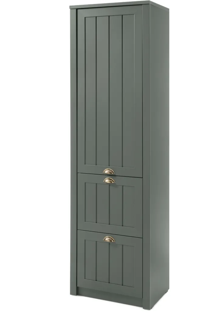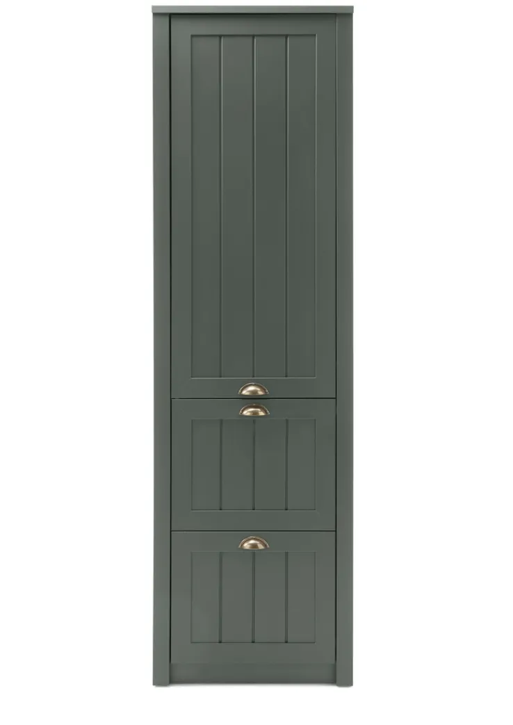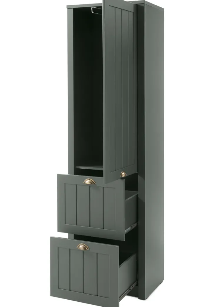 Der grüne Garderobenschrank ASCOT mit den goldfarbigen Griffen aus Metall hat die Maße 60 Zentimeter Breite, 204 Zentimeter Höhe und 42 Zentimeter Tiefe. In den beiden Schubkästen und hinter der Drehtüre bietet das Modell viel Stauraum.