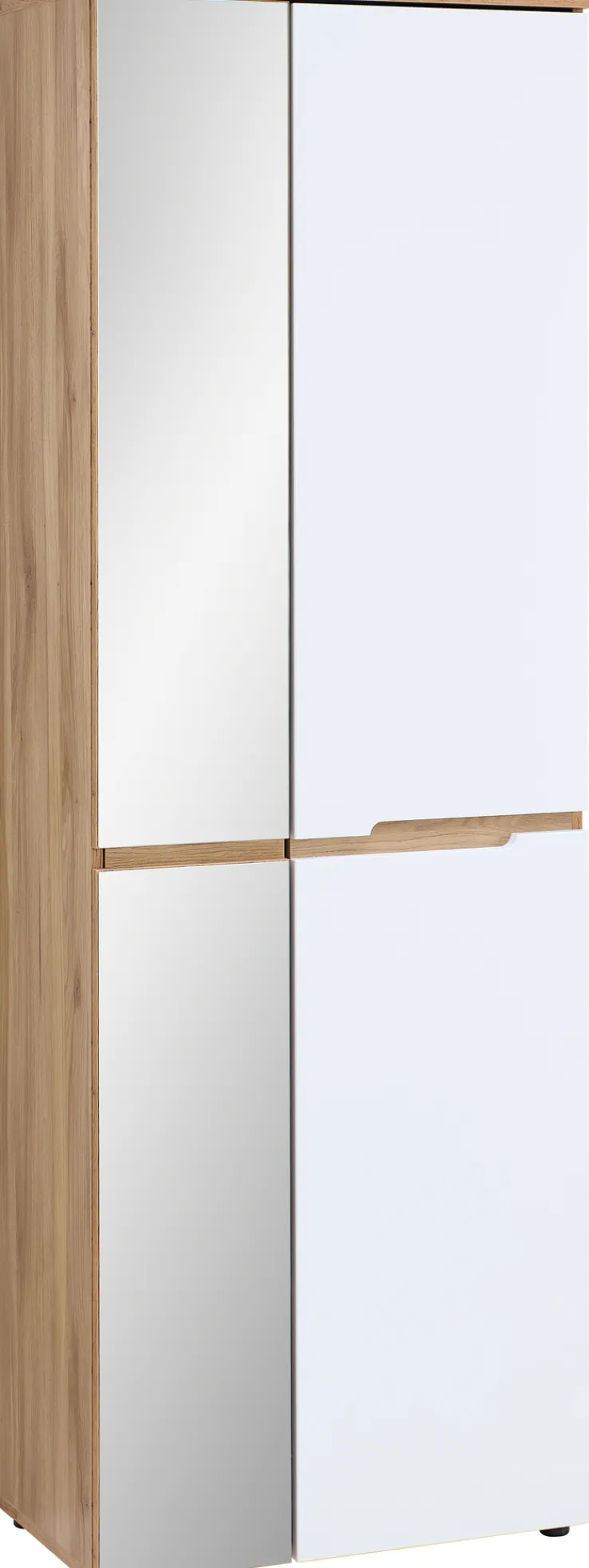 Das Design des Schranks besticht durch seine klare Linienführung und die Kombination aus Weiß Supermatt und Mauvella-Eiche-Dekor. Die grifflosen Türen verleihen dem Schrank eine elegante Optik, während die Eiche-Dekorfarbe einen natürlichen Akzent setzt. Die Verwendung von Glas und Holznachbildung in Mattoptik unterstreicht den modernen Stil des Möbelstücks. Der Schrank ist aus Spanplatte und mitteldichter Faserplatte (MDF) gefertigt, was für Stabilität und Langlebigkeit sorgt.