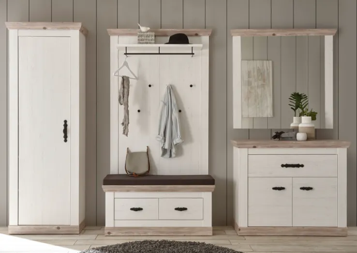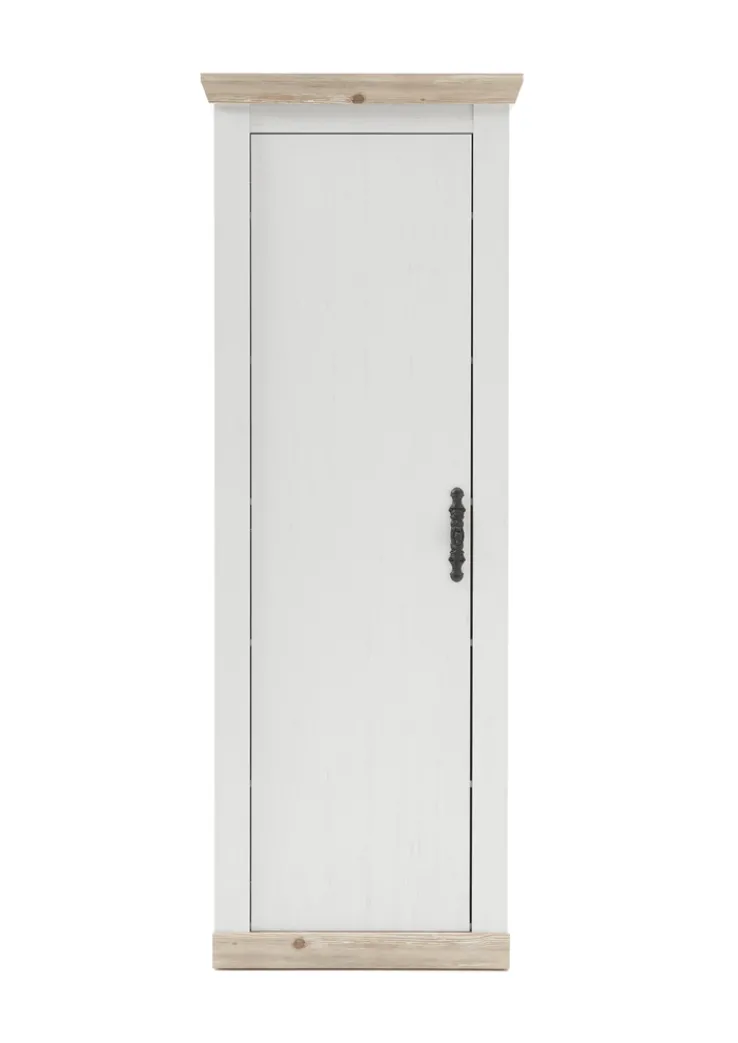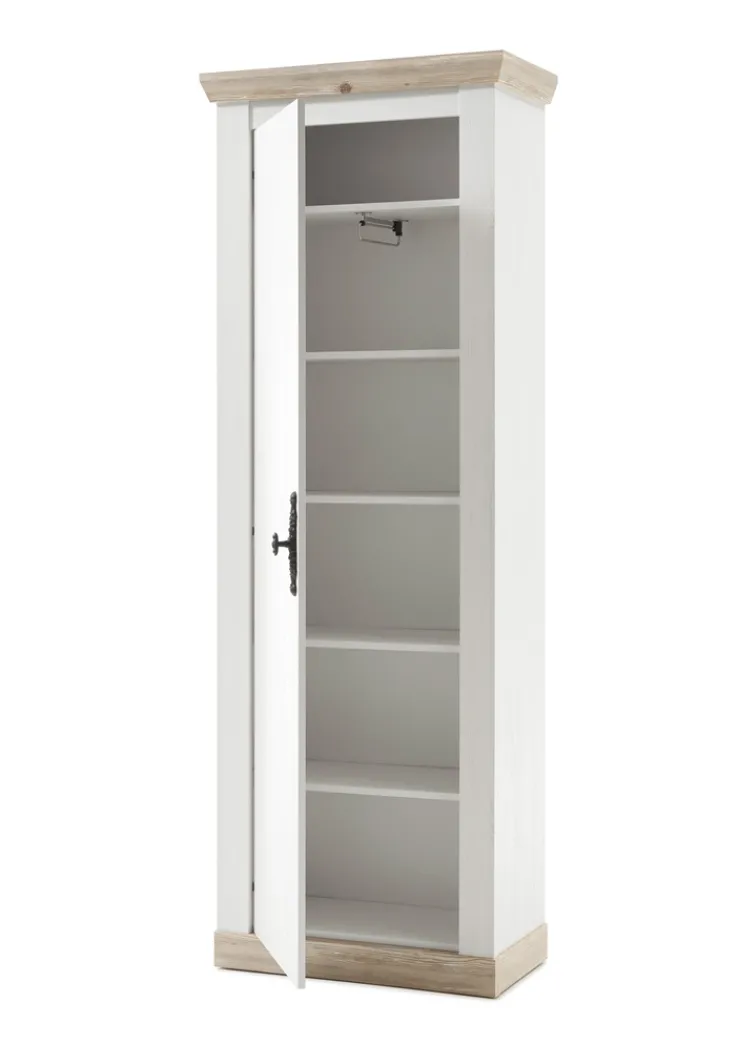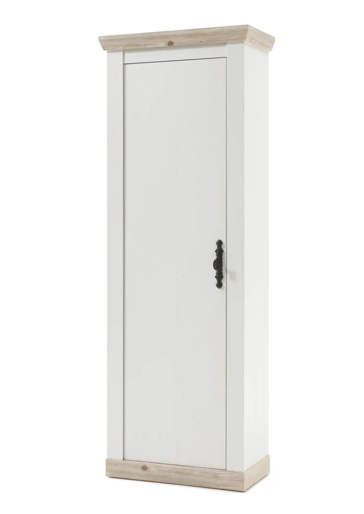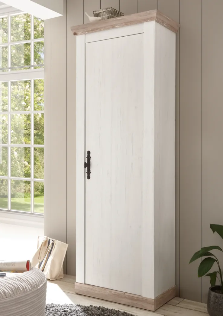 Der Garderobenschrank FLORENZ präsentiert sich im charmanten Landhausstil mit Front und Korpus in weißem Pinie-Dekor sowie Applikationen in braunem Pinie-Oslo-Dekor. Die hochwertige Holznachbildung mit sichtbarer Maserung verleiht dem Schrank eine wohnliche Ausstrahlung.