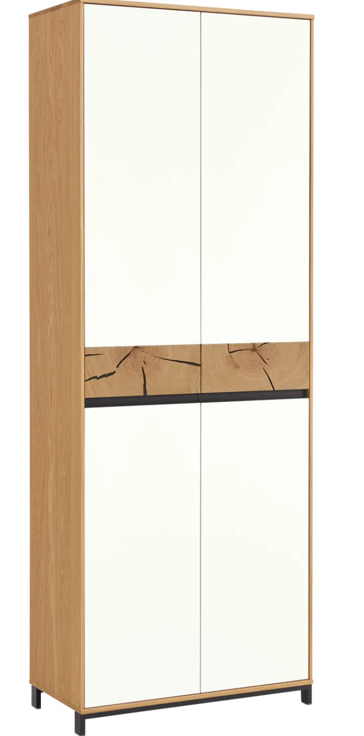 Die Kombination aus Weiß und Eiche verleiht dem Schrank ein zeitloses und stilvolles Erscheinungsbild, das sich nahtlos in verschiedene Wohnstile einfügt. Die klaren Linien und die schlichte Formgebung unterstreichen das moderne Design, während die natürliche Holzoptik für eine gemütliche Atmosphäre sorgt.