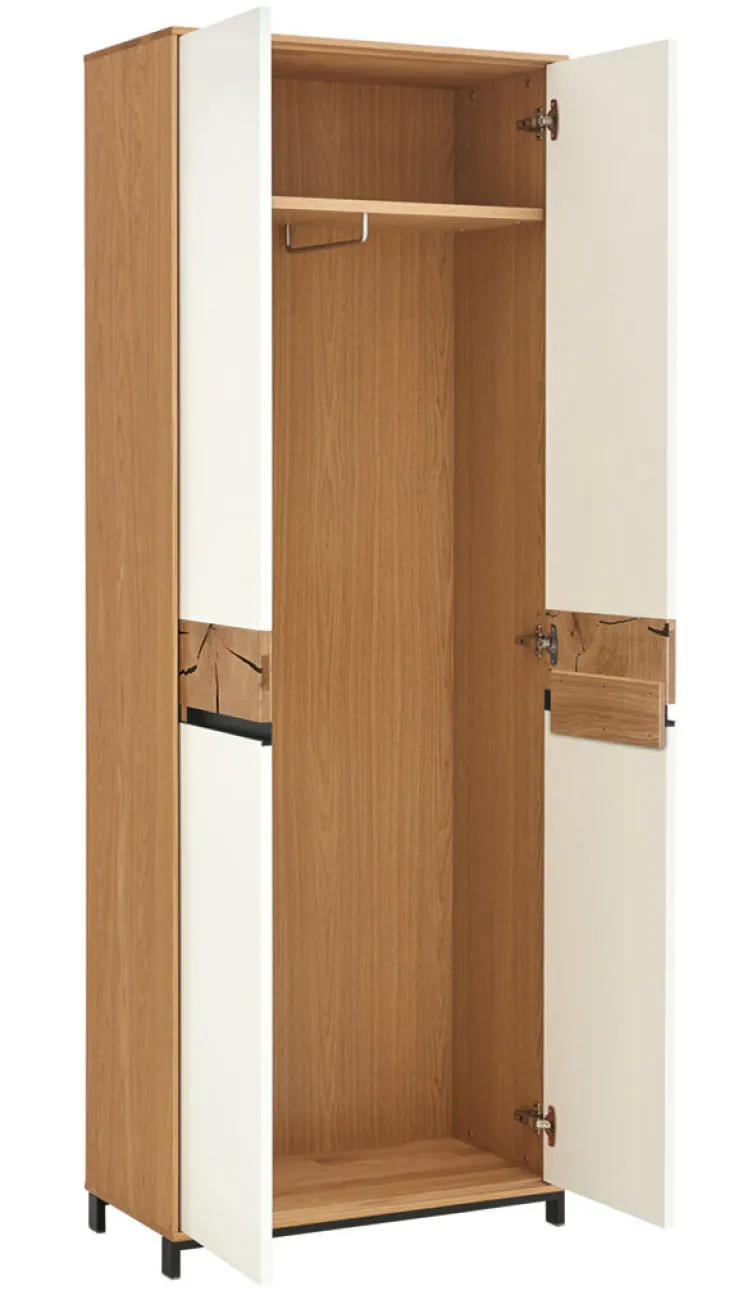 Mit einer Breite von 72 cm, einer Höhe von 195 cm und einer Tiefe von 37 cm bietet er ausreichend Stauraum für Ihre Garderobe. Die Hauptfarbe des Schranks ist Weiß, ergänzt durch dekorative Elemente in Eiche Bianco und massives Hirnholz, die dem Möbelstück eine natürliche und warme Ausstrahlung verleihen. Der Schrank besteht aus einer hochwertigen Holznachbildung, die durch eine lackierte Oberfläche veredelt wird.