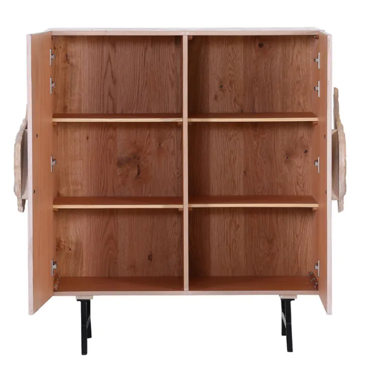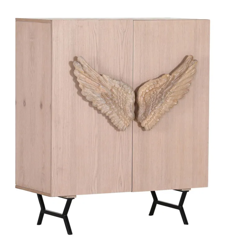 Die INTERhome Kommode HEAVEN & HELL hat natürlich nicht nur optisch einiges zu bieten. Sie ist aus massivem Eichen- und Mangoholz gefertigt und bietet mit einer Größe von 100 x 117 x 51 cm viel Stauraum bei möglichst geringem Platzbedarf. Hinter den Drehtüren, die sich an den Engelsflügen öffnen lassen, lassen sich Alltagsgegenstände in sechs Fächer übersichtlich aufbewahren. Die elegante Optik perfektionieren schwarz pulverbeschichtete Füße aus Metall. Mit ihrem extravaganten Look macht die Kommode in modern und klassisch eingerichteten Wohnräumen gleichermaßen eine gute Figur.
