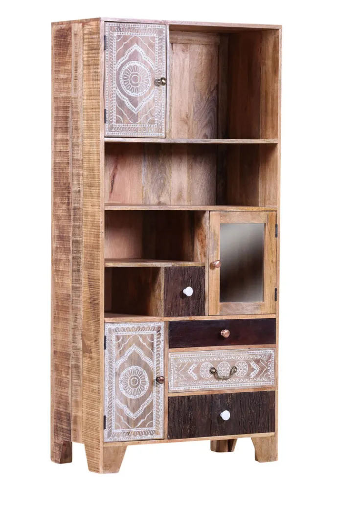 Dieses Möbel hat eine Tiefe von 44 cm und ist dank seiner Form sowie seiner kunstvollen Verzierungen ein echter Hingucker in jedem Raum. Ausgestattet ist die Vitrine mit vier offenen Fächern, in denen sich etwa Dekoartikel unterbringen lassen; gleiches gilt auch für das Fach hinter der Glas-Drehtür. Hinter den beiden weiteren Drehtüren, die nicht einsehbar sind, können funktionale Dinge gelagert werden; dies gilt auch für die vier Schubkästen.