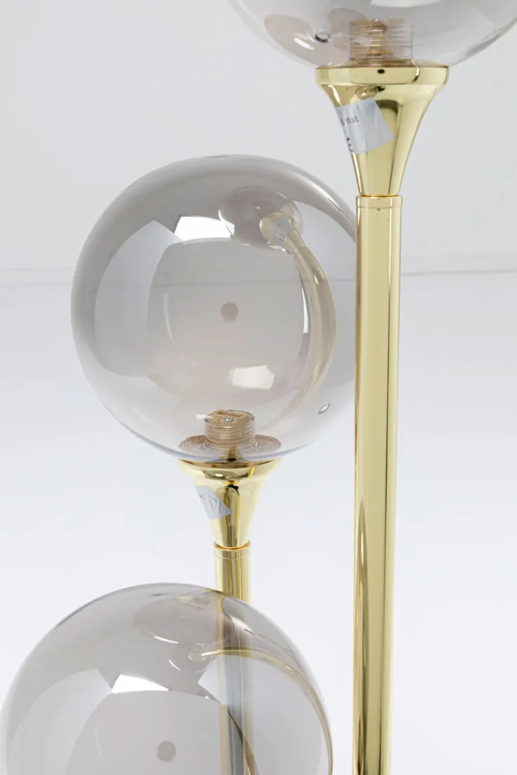 Die goldfarbige Retrofit Stehlampe AL CAPONE TRE von KARE DESIGN präsentiert sich elegant mit drei kugelförmigen Schirmen aus getöntem Glas und einem runden Fuß aus edlem Marmor. Dank der wunderschönen Materialien ist die etwa 82 cm hohe Lampe mit drei Brennstellen beleuchtet und unbeleuchtet ein Blickfang. Sie passt im Wohnzimmer zu geschmackvollen Möbeln oder ist auch im Schlafzimmer neben dem Bett am richtigen Platz.