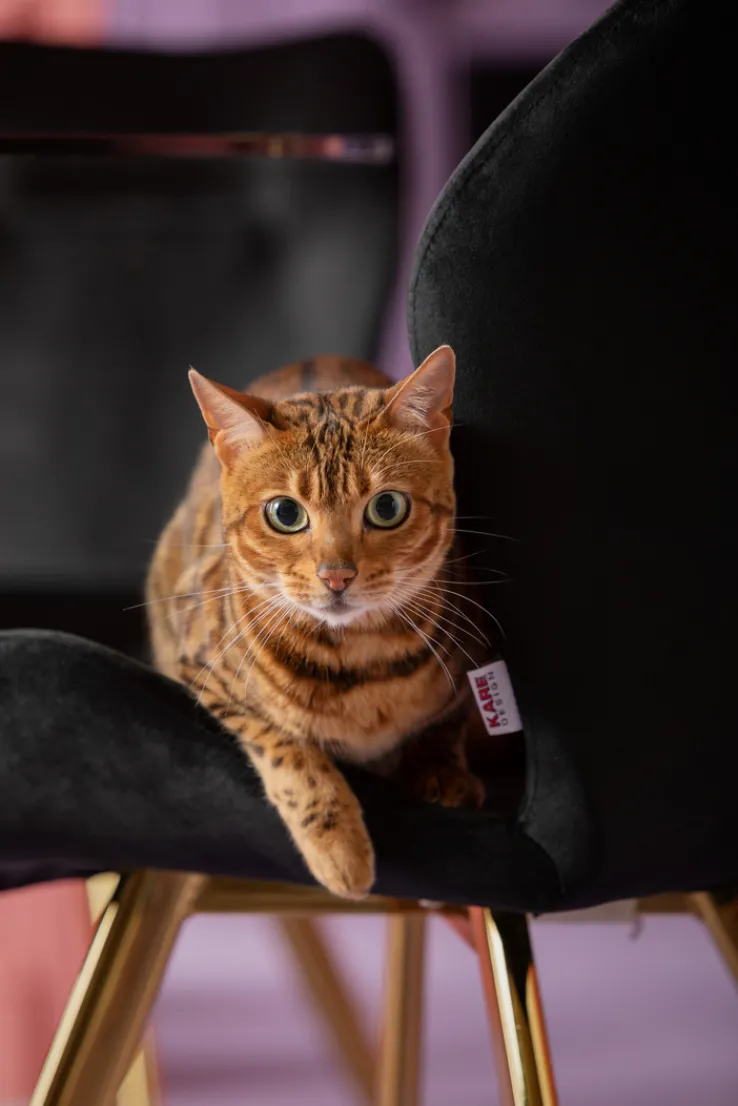 Der Esszimmerstuhl aus der Serie VIVA von Kare Design vereint stilvolles Design mit hochwertigen Materialien. Der Stuhl präsentiert sich in einem eleganten Schwarz, das durch die samtige Textiloberfläche aus Polyester eine luxuriöse Note erhält. Die goldfarbenen Stahlbeine im Vierfußgestell verleihen dem Stuhl nicht nur Stabilität, sondern auch einen modernen, edlen Look. Mit einer Breite von 50 cm, einer Höhe von 82 cm und einer Tiefe von 59 cm bietet der Stuhl eine komfortable Sitzhöhe von 47 cm.