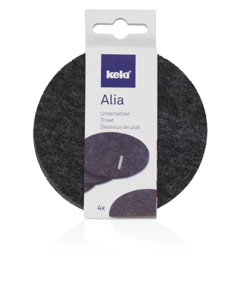 Die rund gestalteten kela Untersetzer ALIA in der Farbe Dunkelgrau sind Ausdruck gepflegter Wohnkultur. Im praktischen 4er Set machen sie sich bei jeder Gelegenheit nützlich.