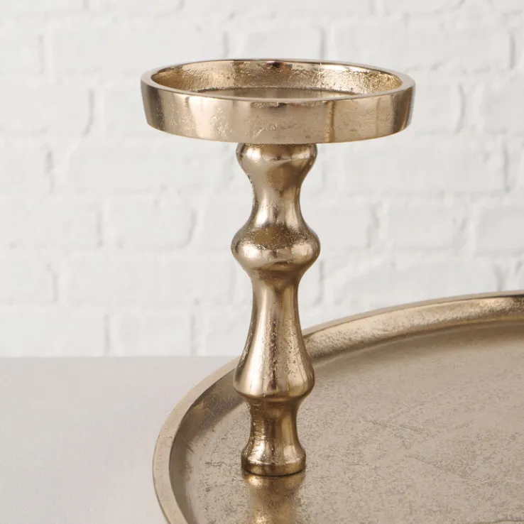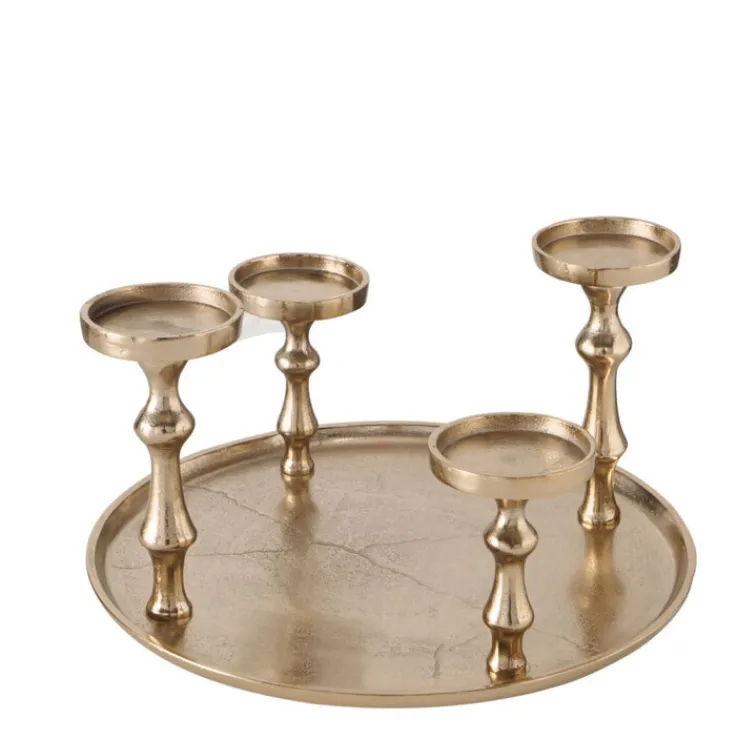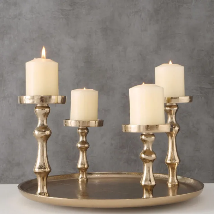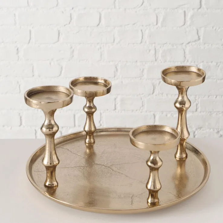 Der goldfarbige Kerzenleuchter FURO kann wunderbar als Alternative zum klassischen Adventskranz genutzt werden. Er bietet sich aber auch für das restliche Jahr ganz wunderbar als festliches Wohnaccessoire an. Der Kerzenleuchter besteht aus einem runden Teller und vier Sockeln, auf denen jeweils eine Stumpenkerze platziert werden kann. Mit seinem goldfarbigen Design passt er hervorragend zu bordeauxroten oder tannengrünen Kerzen. Doch auch mit minimalistischen Modellen in strahlendem Weiß lässt er sich gut kombinieren. Da der Kerzenleuchter aus Aluminium besteht, ist er sehr robust, zugleich aber auch angenehm leicht. Er kann auf dem Sofatisch oder auch auf einem Sideboard platziert werden und sorgt in Kombination mit Kerzen für ein wunderbar gemütliches Licht.