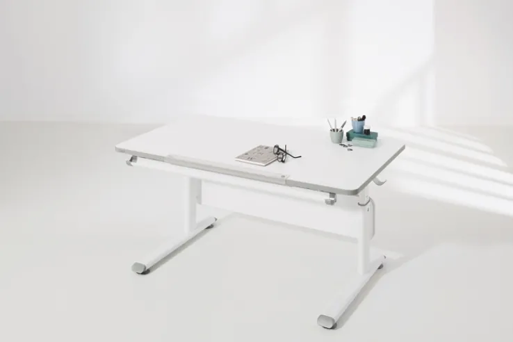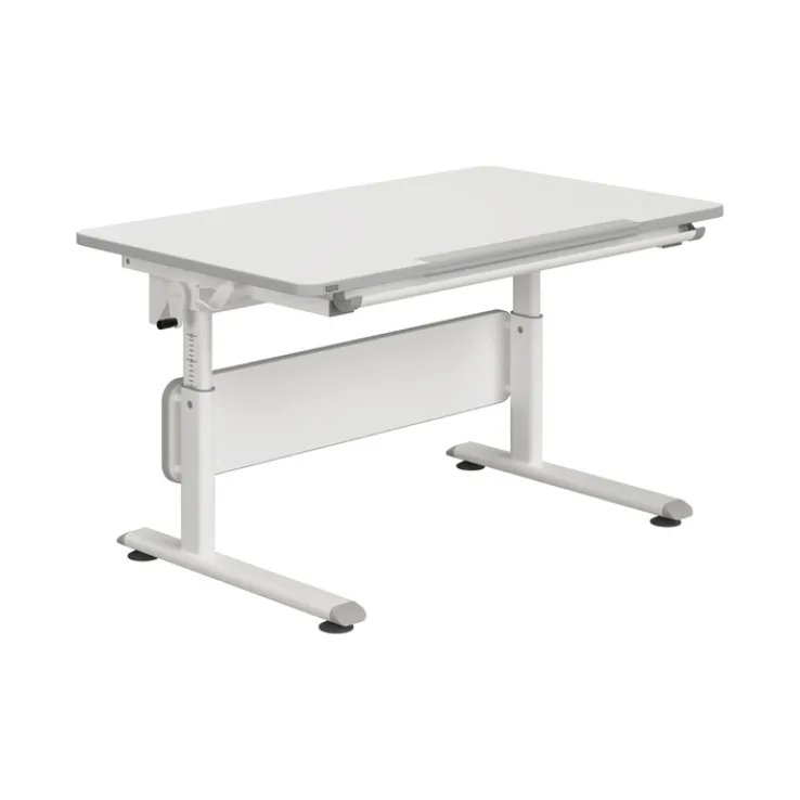 Mit seiner optimal dimensionierten Tischplatte gibt der Schreibtisch einem Kind genügend Platz für Schularbeiten und ermöglicht ergonomisch korrektes Sitzen. Mittels abnehmbarer Kurbel wird die Höhe den Bedürfnissen des Kindes angepasst. Drei integrierte Rasterscheren ermöglichen die Schrägstellung der Tischplatte bis maximal 19 Grad. Das standfeste Gestell kann für die horizontale Ausrichtung dem Fußboden angepasst werden. Zum Lieferumfang gehört ein Lineal, welches zudem als Kantenschutz fungiert und ein Abrutschen von Stiften und Co. verhindert. An beiden Seiten montierbare Taschenhaken runden die Ausstattung ab.