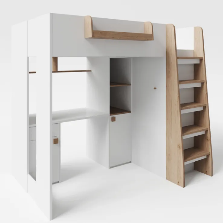 Dieses Hochbett aus der Serie SMALL WORLD ARTESANA bietet eine platzsparende Lösung für das Kinderzimmer und kombiniert Schlafplatz, Stauraum und Arbeitsplatz in einem Möbelstück. Die Konstruktion besteht aus Holznachbildung auf Basis von Spanplatte und zeichnet sich durch eine moderne Formgebung aus. Die Hauptfarbe ist Weiß, ergänzt durch natürliche Akzente in Artisan Eiche. Die sichtbaren Fronten und Ablagen sind in einem warmen Holzton gehalten, während Korpus, Türen und Schubladen in einem klaren Weiß gestaltet sind. Die Kombination verleiht dem Möbel eine zeitgemäße Optik, die sich in viele Einrichtungsstile integrieren lässt. Die Maße betragen 205,5 cm in der Länge, 153 cm in der Breite und 190 cm in der Höhe, mit einer Liegefläche von 90 x 200 cm.