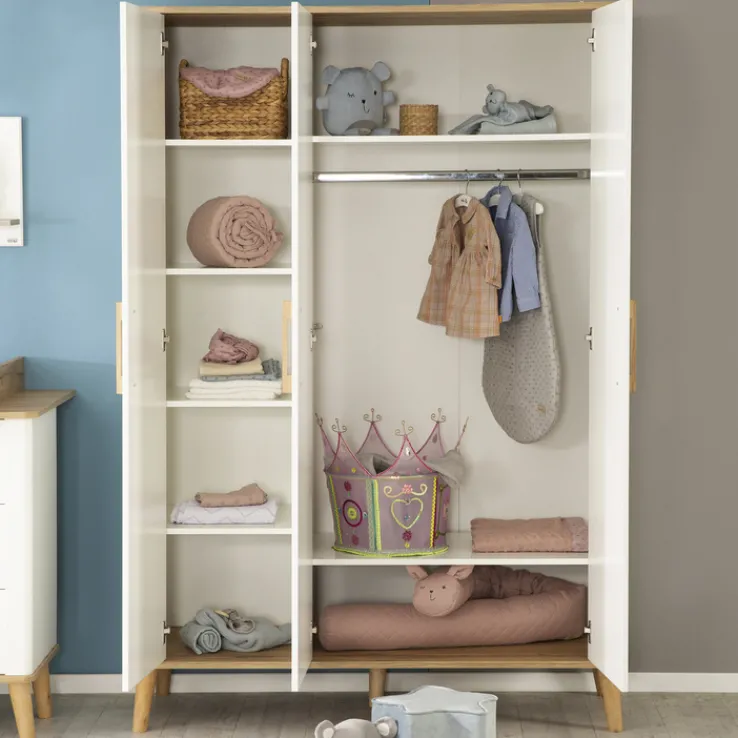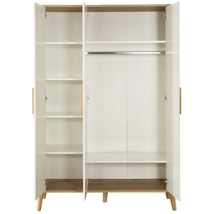 Der Schrank verfügt über drei Drehtüren, die einen einfachen Zugang zum Innenraum ermöglichen. Im Inneren befinden sich eine Kleiderstange und sechs Einlegeböden, die eine flexible Aufbewahrung von Kleidung und anderen Gegenständen erlauben. Das Material aus Holznachbildung sorgt für eine robuste und langlebige Konstruktion. Die klaren Linien und die schlichten Griffe unterstreichen den modernen Stil des Schranks, der sowohl praktisch als auch ästhetisch ansprechend ist.