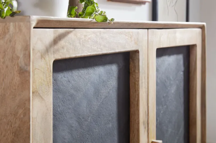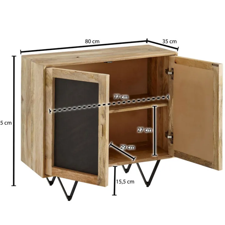 Diese Kommode ist in einem ansprechenden rustikalen Design gehalten, wobei die Front mit einer 3D-Gesteinsoptik ganz besonders hervorsticht und die Metallfüße den positiven Eindruck noch verstärken. Das Möbel hat eine Tiefe von 35 cm und ist mit zwei Drehtüren ausgestattet, die über praktische Griffe verfügen; hinter diesen Drehtüren befindet sich Stauraum für die Dinge, die man schnell und unkompliziert in etwa dem Wohnzimmer unterbringen möchte, womit die Kommode die Ordnung im Raum unterstützt.